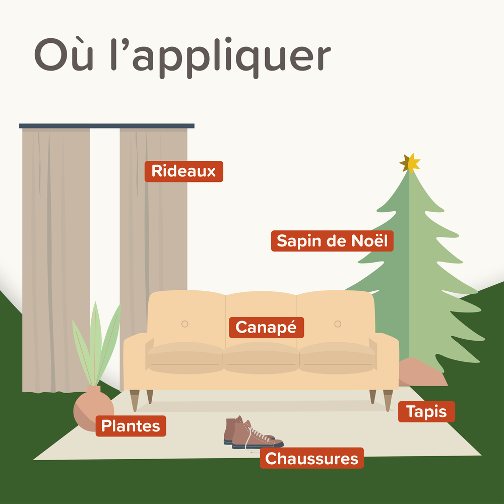 | Mode d'emploi | Vaporisez le produit sur les zones que vous souhaitez protéger, comme les meubles, les tapis, les greniers ou les toits. Ce produit convient à tous les types de surfaces. Utilisez 3 ml de liquide pour 1 m² (5 pulvérisations) et appliquez chaque semaine pour un résultat optimal. Veuillez noter que l’efficacité peut diminuer lorsque les surfaces traitées sont nettoyées. Dans ces cas-là, réappliquez le produit, au maximum une fois par semaine. Il agit immédiatement après l’application. |