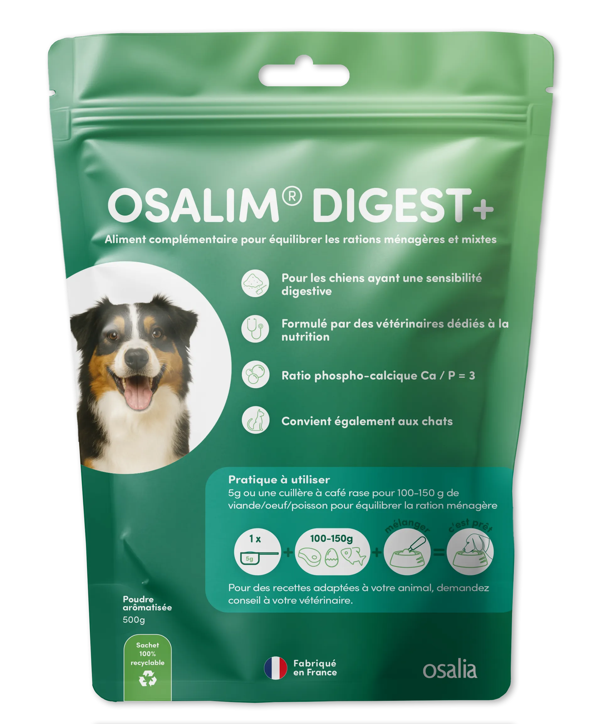 Osalim Digest+ est un aliment complémentaire spécialement formulé pour répondre aux besoins des animaux présentant une sensibilité digestive. Il soutient la santé intestinale en apportant un mélange ciblé de fibres, de ferments lactiques et de micronutriments essentiels.